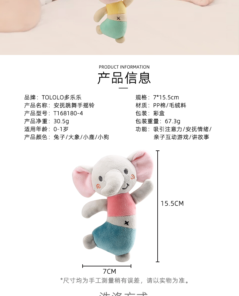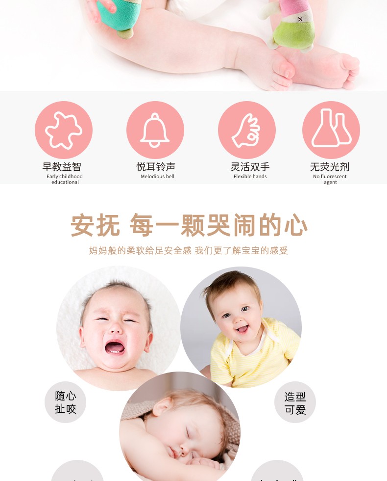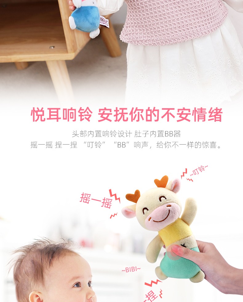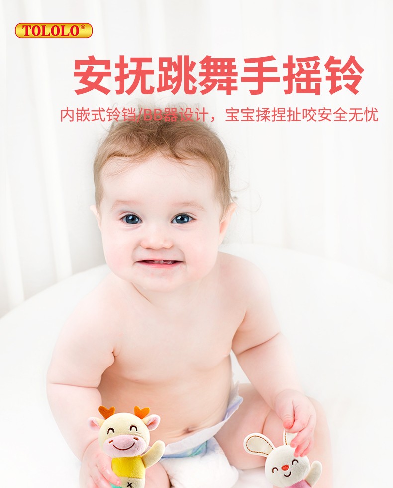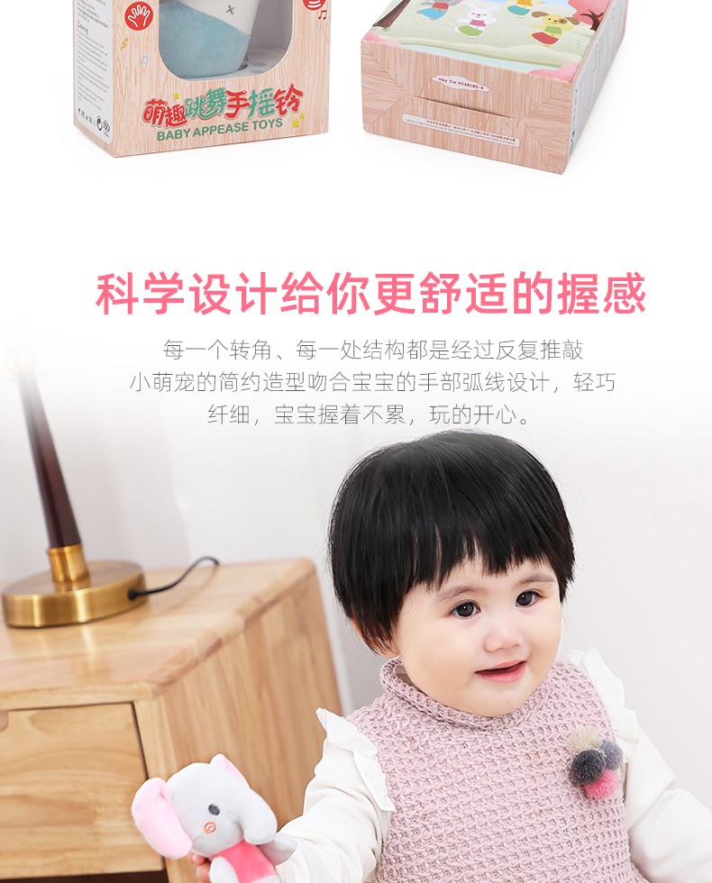 安撫跳舞手搖鈴,科學設計給你更舒適的抓握感。每一個轉(zhuǎn)角,每一處結(jié)構(gòu)都是經(jīng)過反復推敲,小萌寵的簡約造型吻合寶寶的手部弧線設計,輕巧纖細,寶寶握著不累,玩得開心!悅耳響鈴,安撫寶寶的小情緒。安撫跳舞手搖鈴,頭部內(nèi)置響鈴設計,肚子內(nèi)置BB器,搖一搖,捏一捏“叮鈴”“BB”響聲,給你不一樣的驚喜。