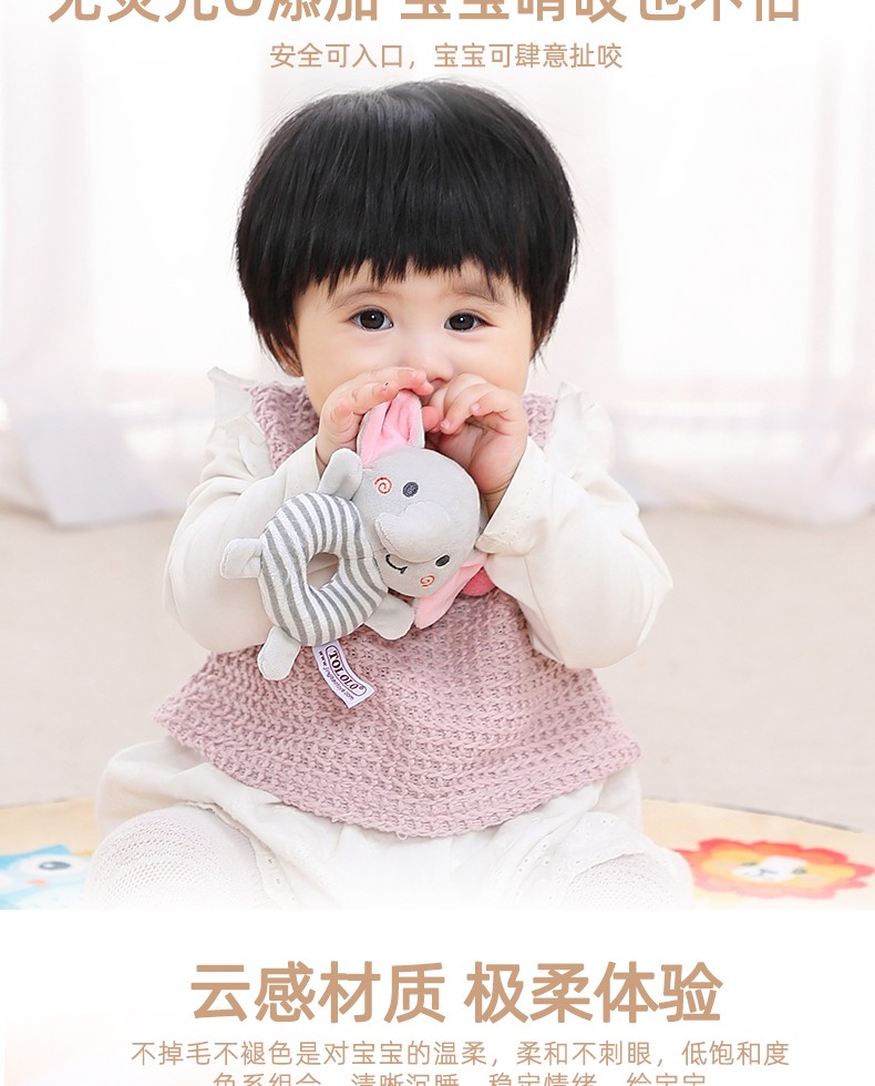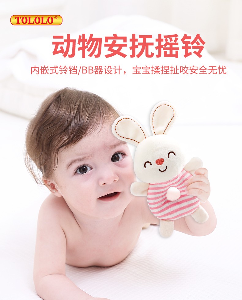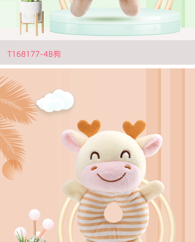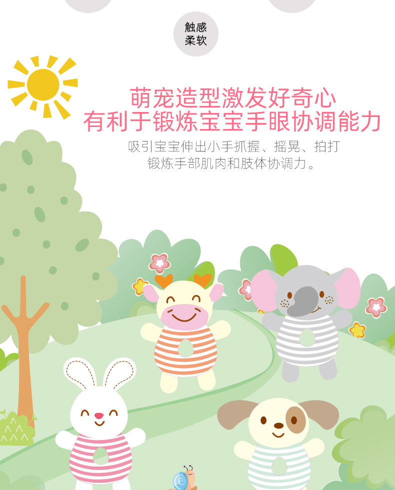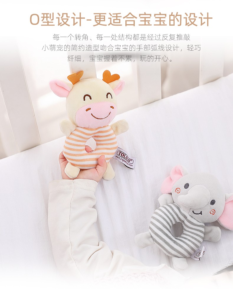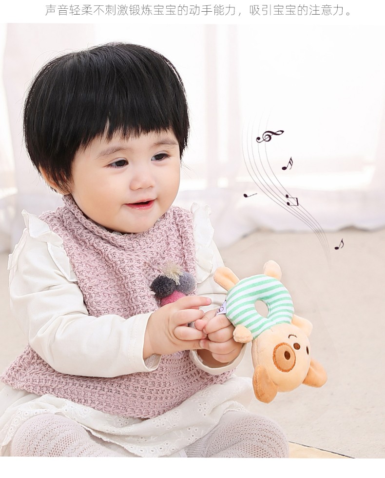 安撫手搖鈴,萌寵造型激發好奇心,有利于鍛煉寶寶手腳協調能力。吸引寶寶伸出小手抓握,搖晃、拍打,鍛煉手部肌肉和肢體協調力。悅耳響鈴,安撫寶寶的小情緒,頭部輕輕一搖“ding”聲,聲音輕柔不到刺激鍛煉寶寶的動手能力,吸引寶寶的注意力。