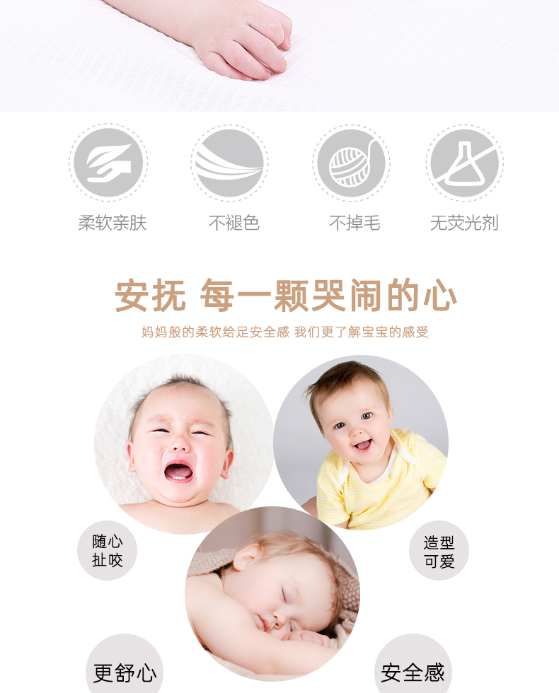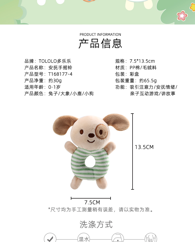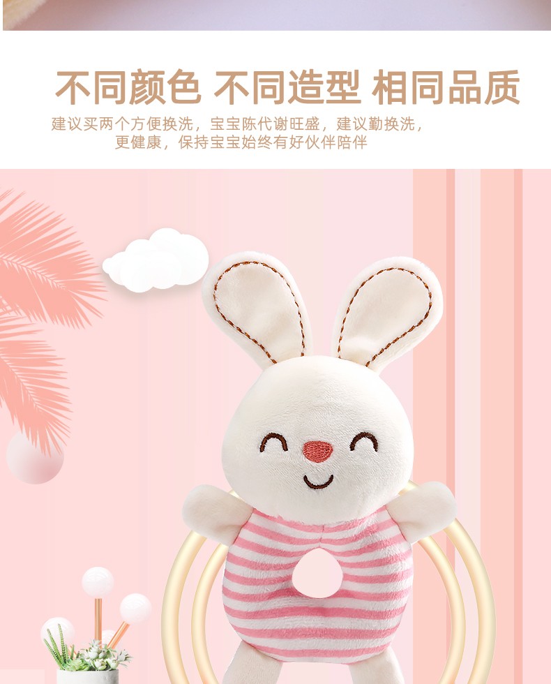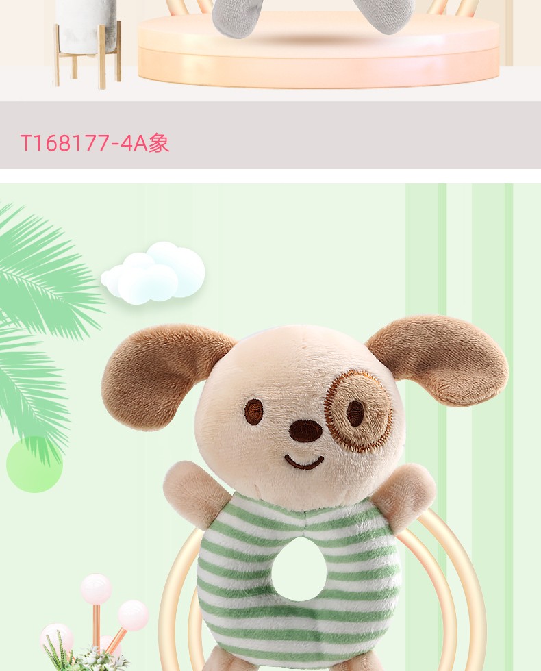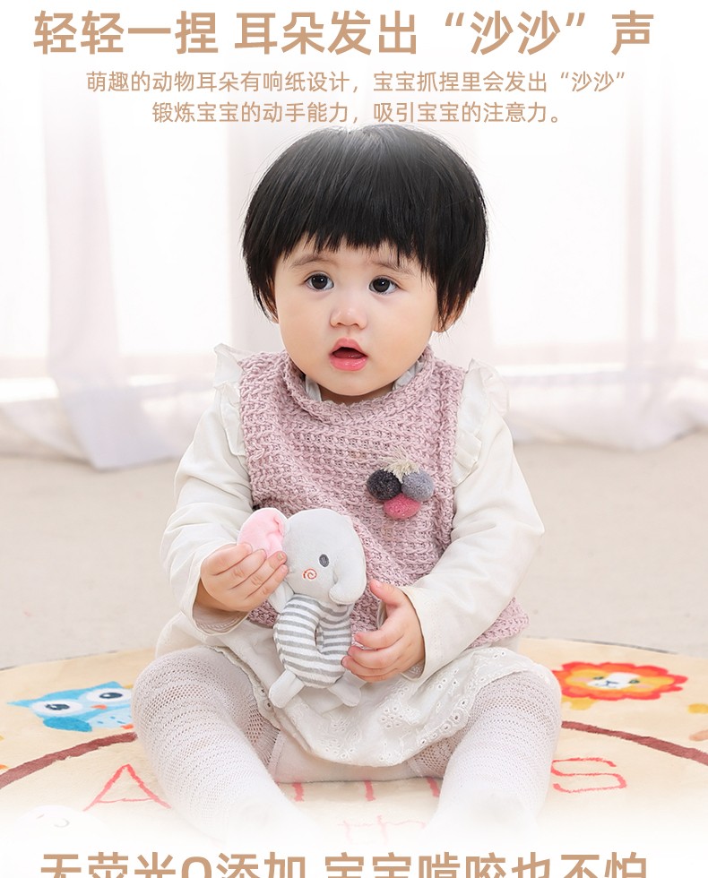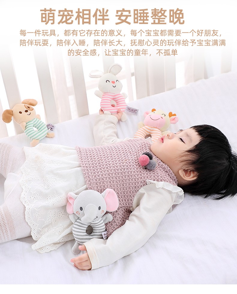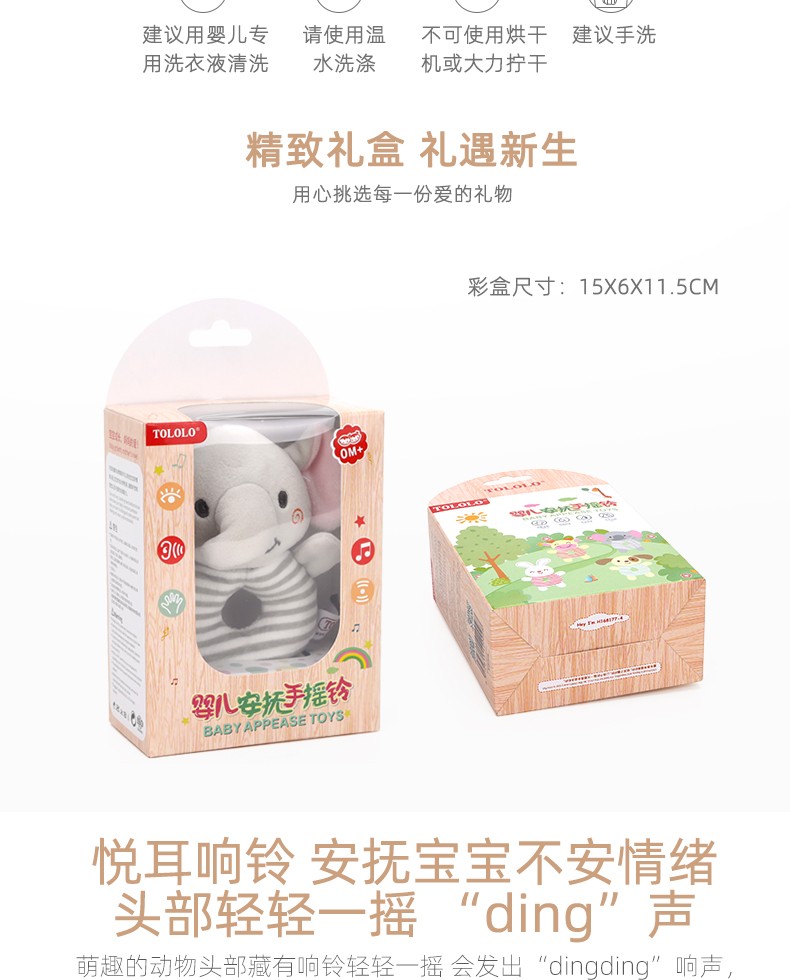 安撫手搖鈴,萌寵造型激發好奇心,有利于鍛煉寶寶手腳協調能力。吸引寶寶伸出小手抓握,搖晃、拍打,鍛煉手部肌肉和肢體協調力。悅耳響鈴,安撫寶寶的小情緒,頭部輕輕一搖“ding”聲,聲音輕柔不到刺激鍛煉寶寶的動手能力,吸引寶寶的注意力。