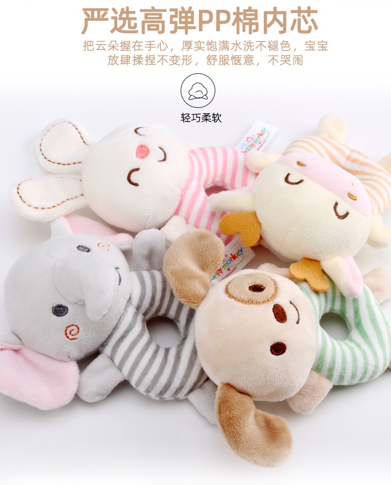 Happy Monkey嬰兒玩具牙膠搖鈴寶寶手搖鈴新生兒玩具毛絨安撫公仔