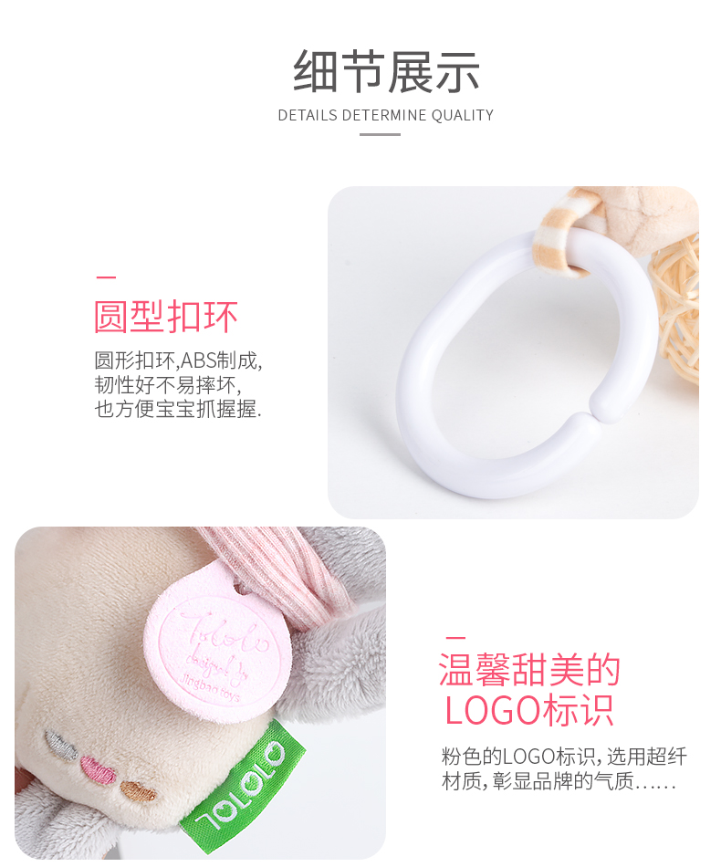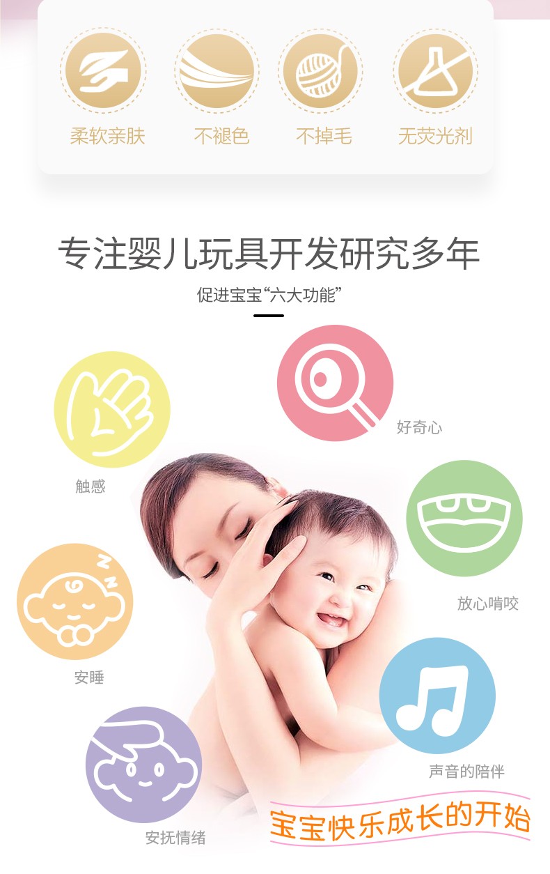 東莞市景寶嬰童玩具用品有限公司是一家集研發、設計、生產和營銷為一體的嬰幼兒玩具及用品有限公司,擁有三百多項自主知識產權的版權和專利,是國內為數不多的真正具有自主品牌的玩具企業。專注研發生產:嬰幼兒毛絨玩具、早教玩具、床鈴玩具、搖鈴玩具、布書玩具、0-1歲寶寶玩具等。18年行業經驗,支持各類嬰兒玩具定制批發,玩具廠家咨詢熱線:0769-86175921