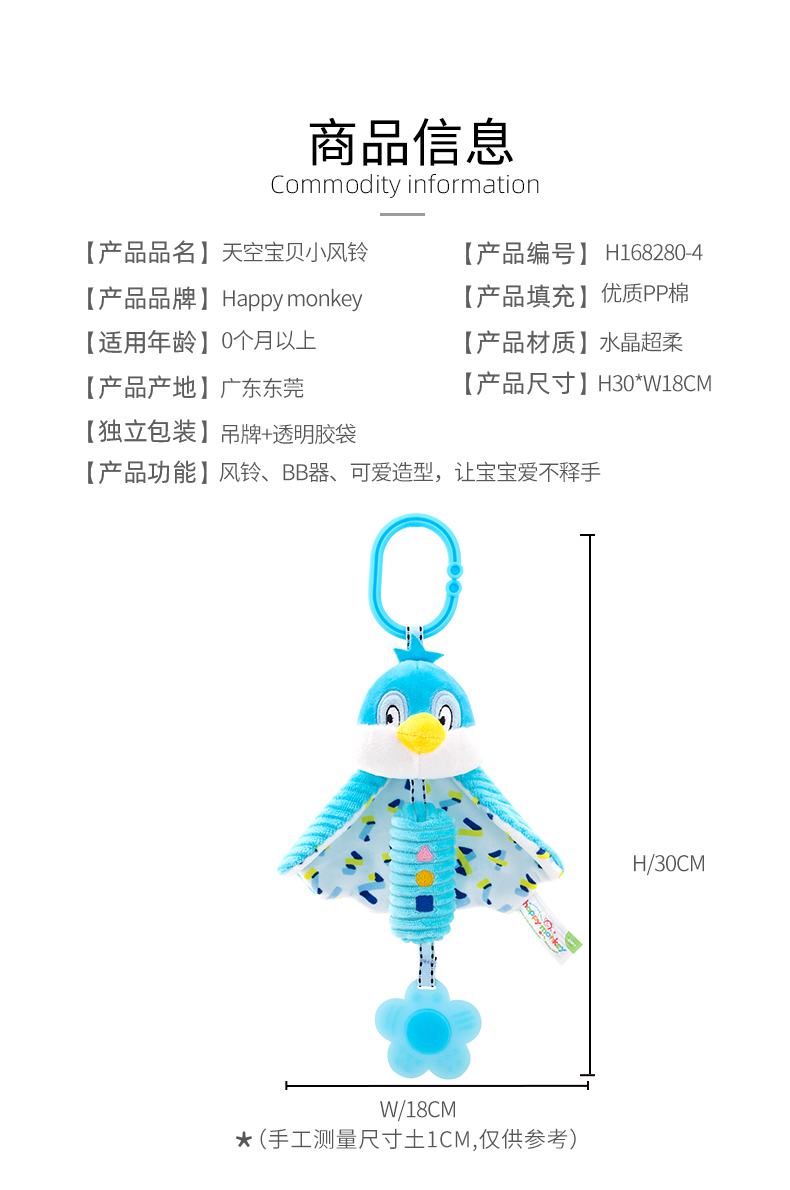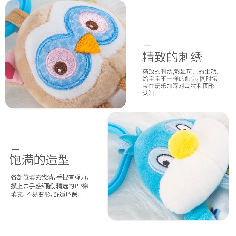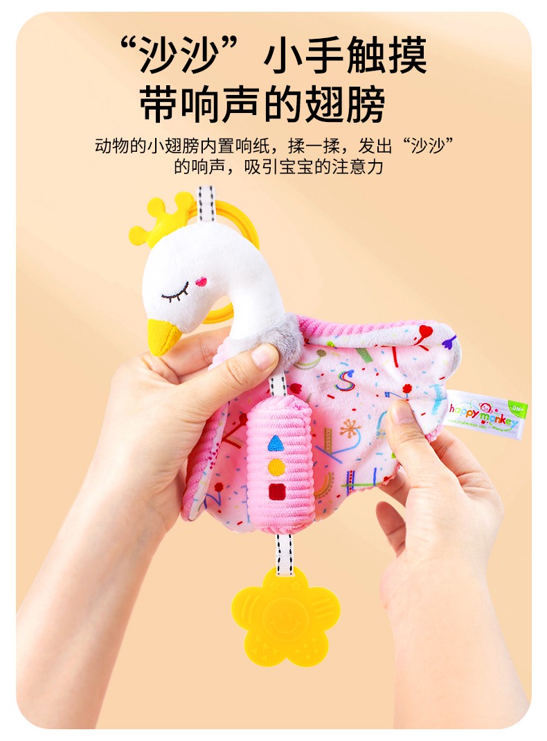 “沙沙”小手觸摸,帶響聲的翅膀:動物的小翅膀內置響紙,揉一揉,發出“沙沙”的響聲,吸引寶寶的注意力